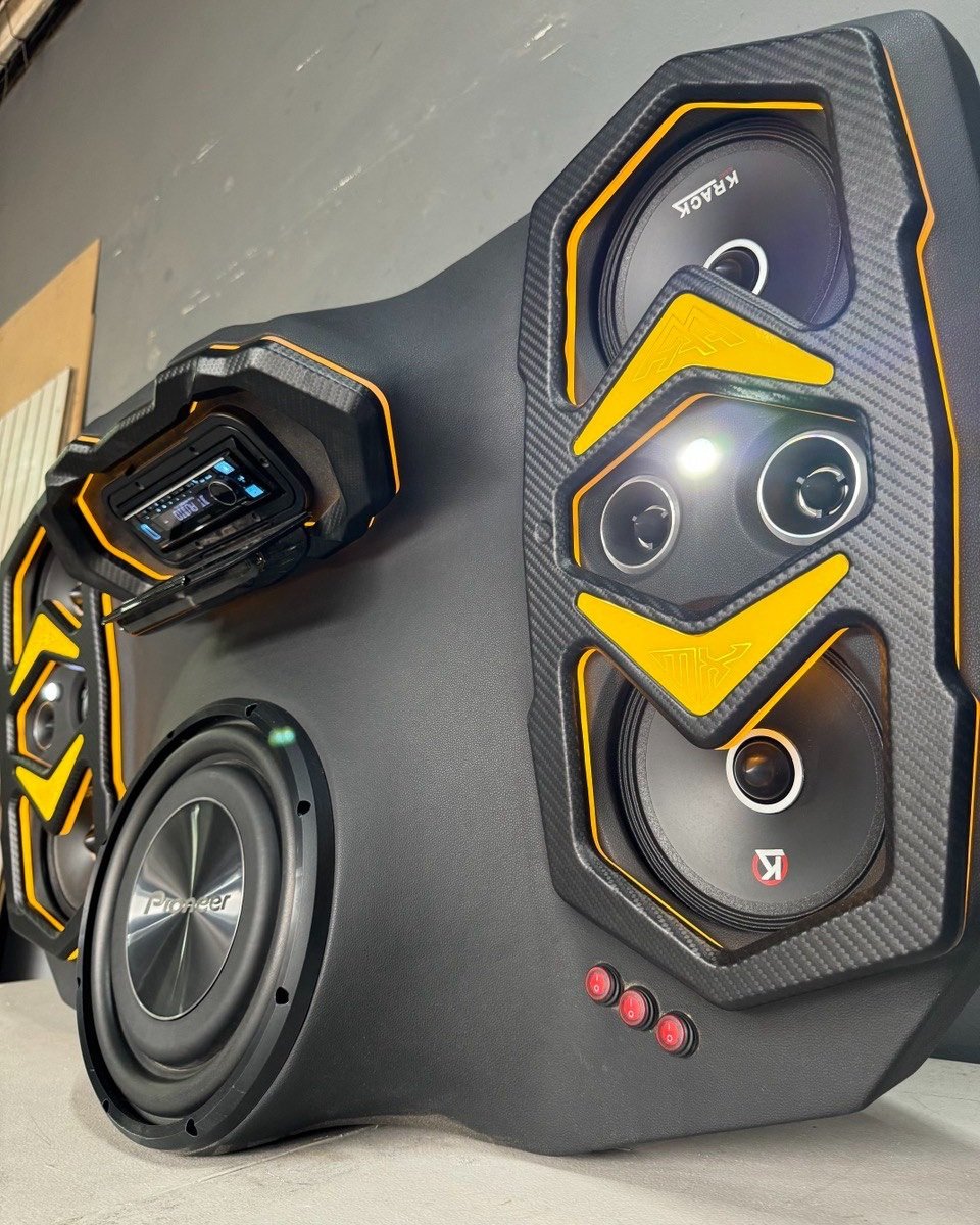 The control section houses a car stereo receiver with Bluetooth, USB, or AUX input options.